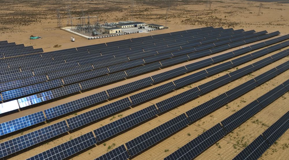2024年5月16日在內(nei) 蒙古巴彥淖爾市磴口縣拍攝的烏(wu) 蘭(lan) 布和沙漠光伏基地(無人機照片)。烏(wu) 蘭(lan) 布和沙漠建設生態光伏基地,采取板上發電、板下種植的辦法,努力把沙海變為(wei) “綠海”。