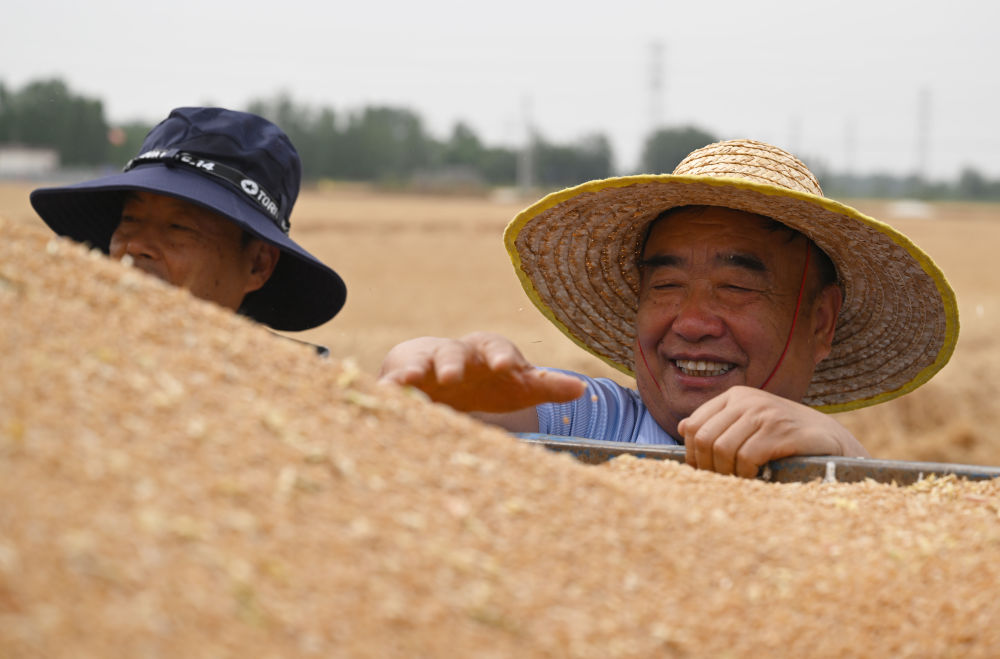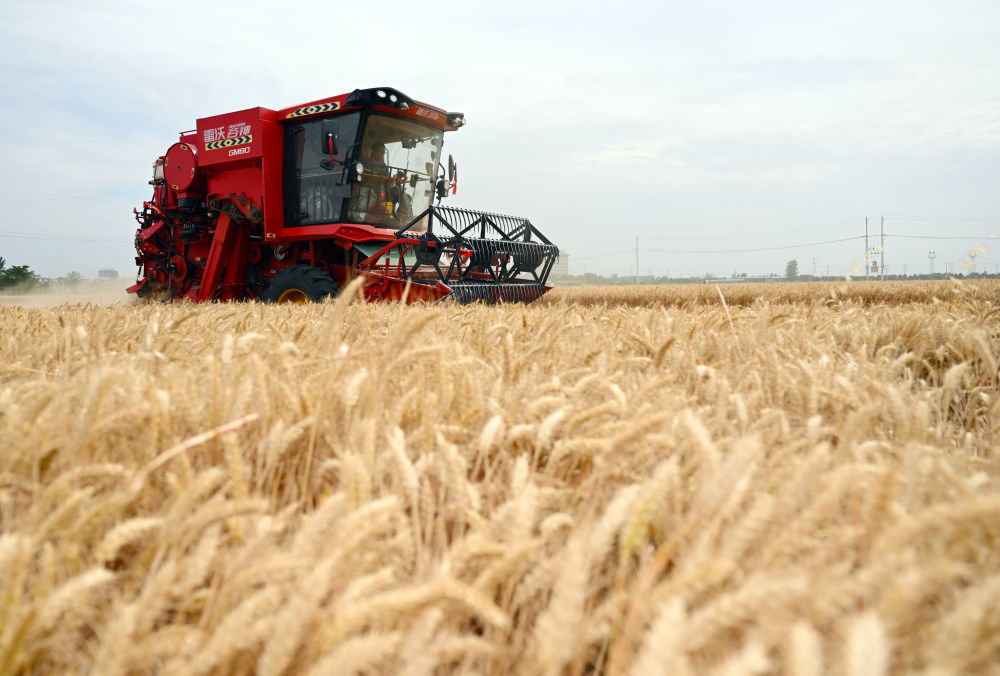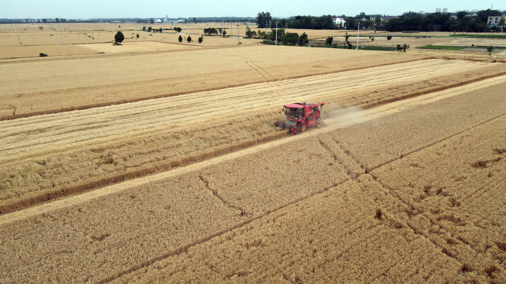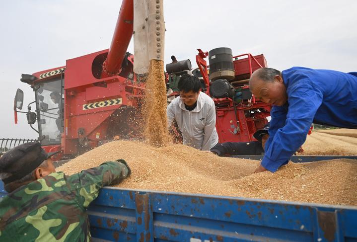 麥收時節,在安徽阜陽太和縣,機器轟鳴,麥浪翻滾如金色綢緞,飽滿的麥粒裝滿一輛輛運糧車的貨廂。