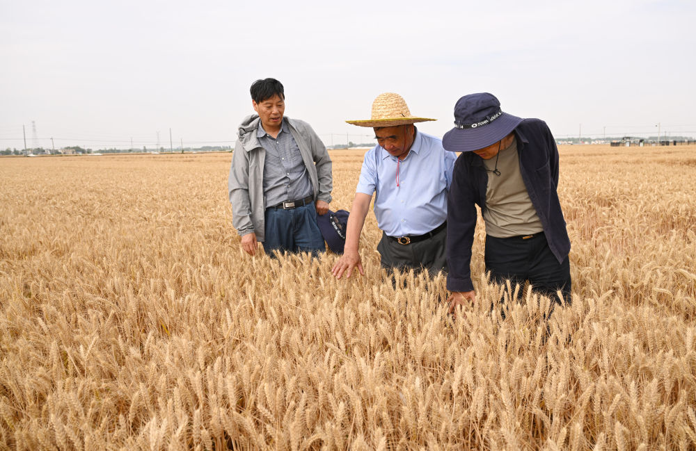 2024年5月29日,在太和縣淙祥現代農(nong) 業(ye) 種植專(zhuan) 業(ye) 合作社,徐淙祥(中)和農(nong) 技專(zhuan) 家一起為(wei) 試驗麥種測產(chan) 。