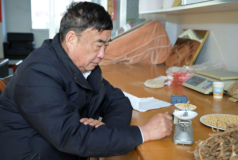 2023年2月21日,在太和縣淙祥現代農(nong) 業(ye) 種植專(zhuan) 業(ye) 合作社,徐淙祥在實驗室裏對農(nong) 作物樣品進行稱重和記錄。