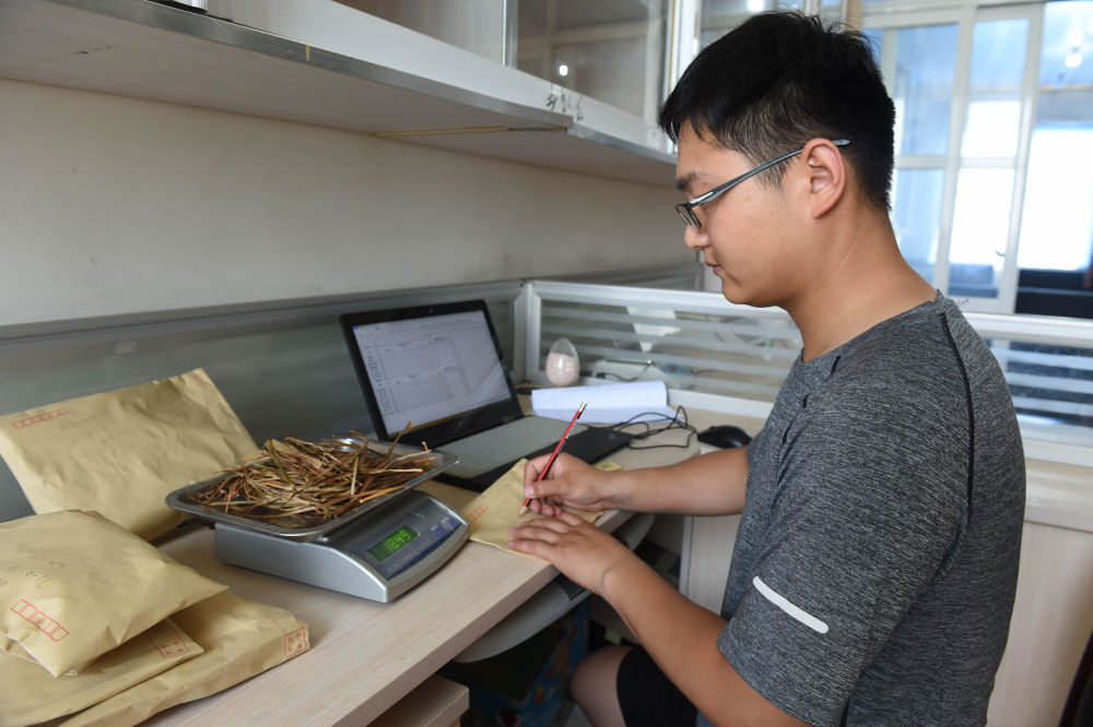 2022年6月28日,在太和縣淙祥現代農(nong) 業(ye) 種植專(zhuan) 業(ye) 合作社,徐旭東(dong) 在實驗室對農(nong) 作物樣品進行稱重和記錄。