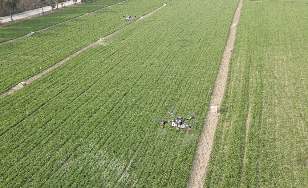 2023年2月21日,在太和縣淙祥現代農(nong) 業(ye) 種植專(zhuan) 業(ye) 合作社,無人機噴灑農(nong) 藥(無人機照片)。