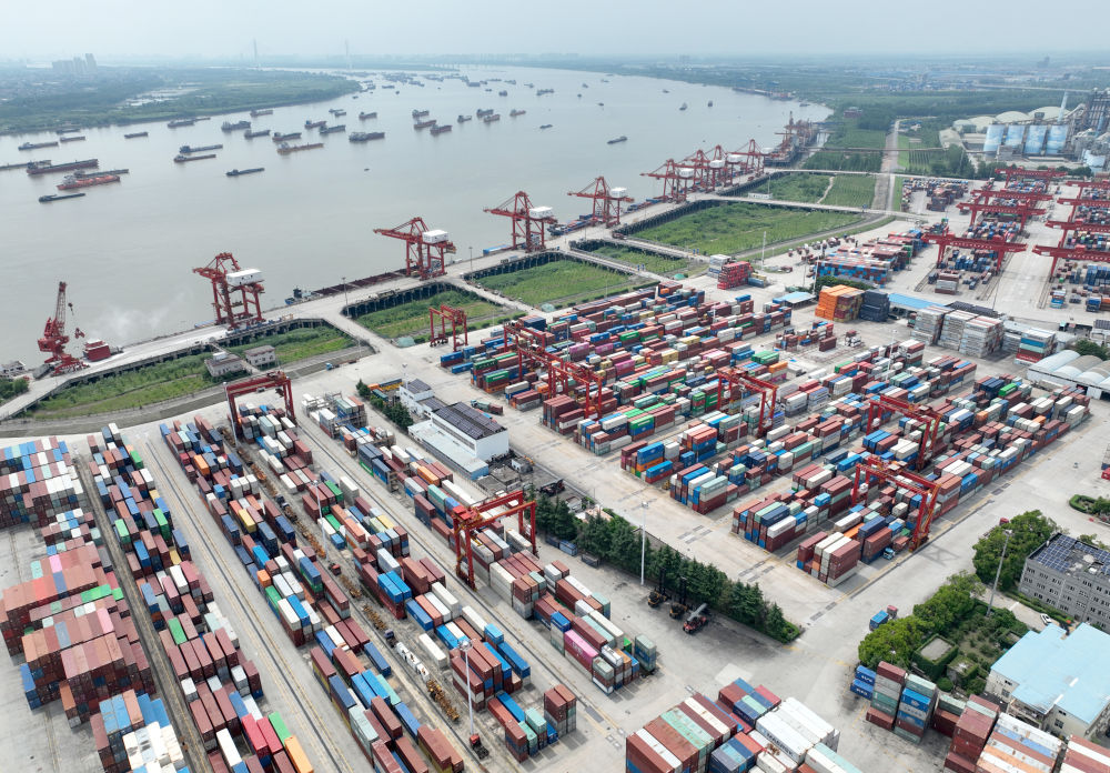 2024年6月1日拍攝的湖北武漢陽邏港(無人機照片)。2013年時,陽邏港僅(jin) 有兩(liang) 條集裝箱航線,船型小、班期少;如今,陽邏港已開通各類集裝箱航線20餘(yu) 條,實現“航運向東(dong) 入海、班列向西入歐”。