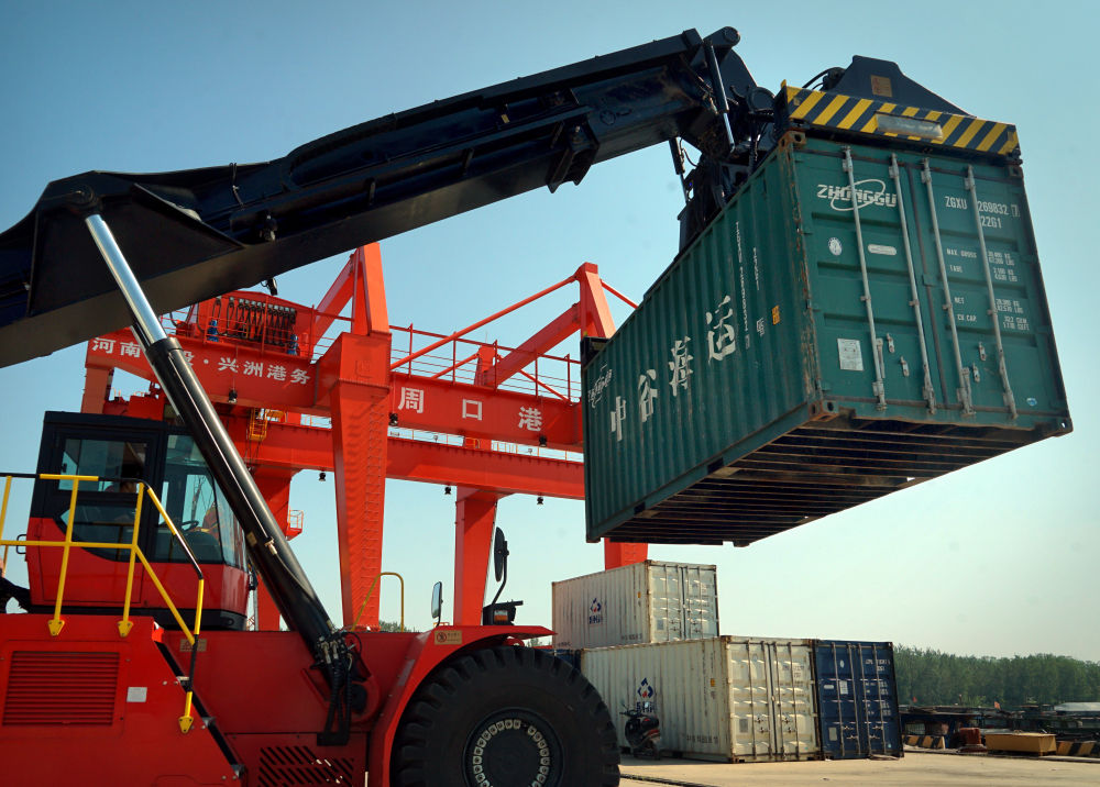 2020年8月27日,工人操作機械設備在河南周口中心港碼頭進行吊裝作業(ye) 。