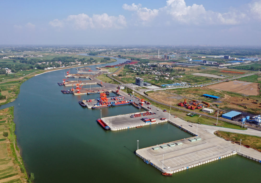 2022年6月28日拍攝的河南周口中心港碼頭(無人機照片)。近年來,河南積極推進沙潁河航道升級改造,疏通內(nei) 河航運。現在,從(cong) 周口中心港出發的船舶可經沙潁河至淮河、京杭大運河駛入長江,讓內(nei) 陸城市亦能通江達海。