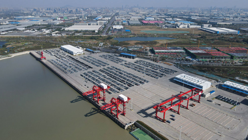 2024年5月26日,在安徽蕪湖港朱家橋港區國際集裝箱碼頭,整齊排列的汽車等待出口(無人機照片)。作為(wei) 安徽省首個(ge) 國家一類開放口岸,蕪湖港現已發展成為(wei) 長三角城市群綜合交通運輸體(ti) 係的重要樞紐。