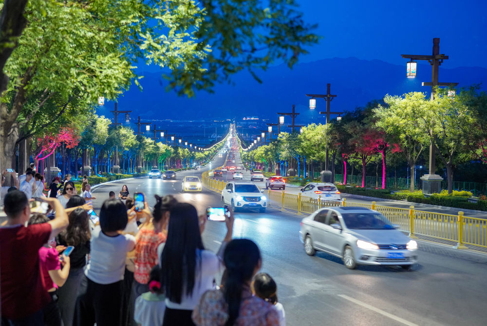 2024年5月21日,遊客在升級改造後的運城市“鹽湖006號燈杆”觀景台拍照。