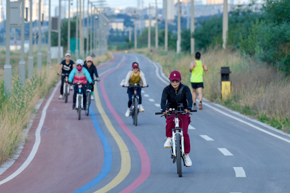 2024年6月5日,人們(men) 在運城鹽湖環湖步道上騎行。