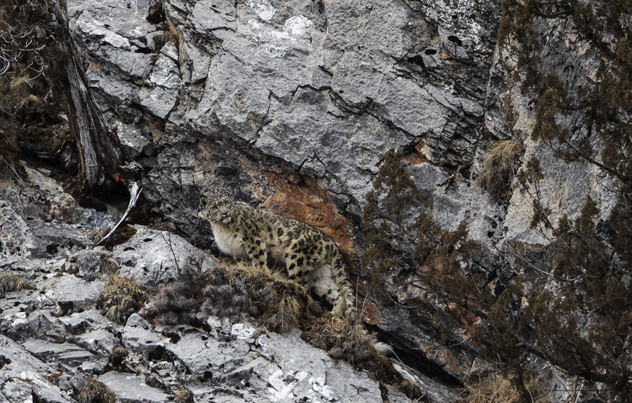 2023年2月21日,在青海省玉樹藏族自治州雜多縣昂賽鄉(xiang) 境內(nei) 的昂賽大峽穀內(nei) ,一隻雪豹準備向上攀爬。新華社記者 費茂華 攝