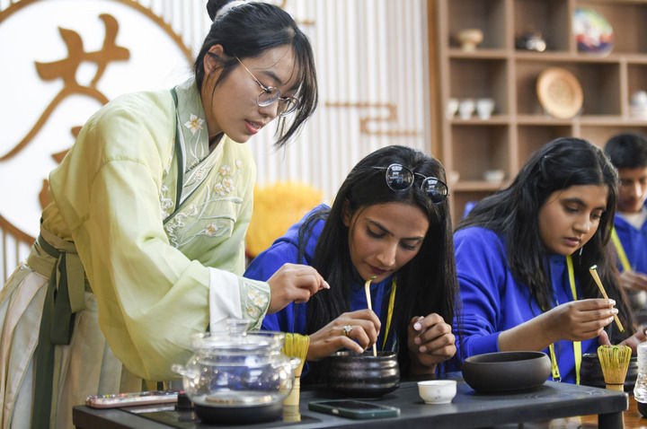 2024年4月15日,參加2024年“漢語橋”上合組織國家青年學生春令營的來華青年學生在新疆師範大學學生(左)的指導下學習(xi) 茶藝。