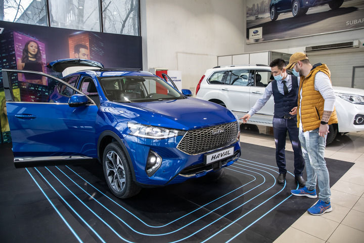2021年4月1日,銷售人員在哈薩克斯坦阿拉木圖市經銷商店向消費者介紹哈弗汽車。