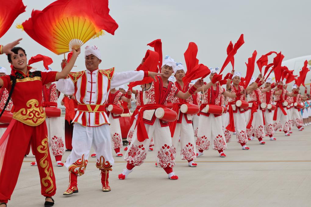 2023年5月17日下午,出席中國-中亞(ya) 峰會(hui) 的哈薩克斯坦總統托卡耶夫抵達陝西省西安市。當地民眾(zhong) 以熱情的腰鼓、歡快的秧歌等民間藝術表演歡迎貴賓到來。新華社記者 邢廣利 攝