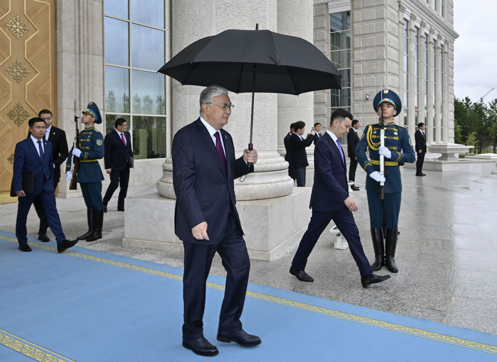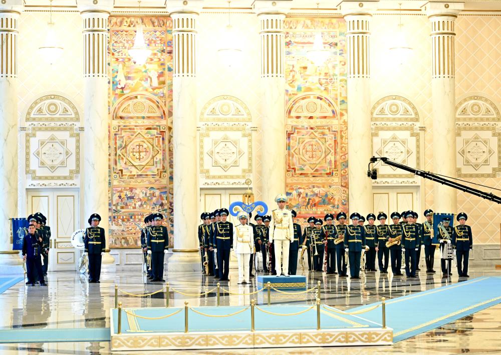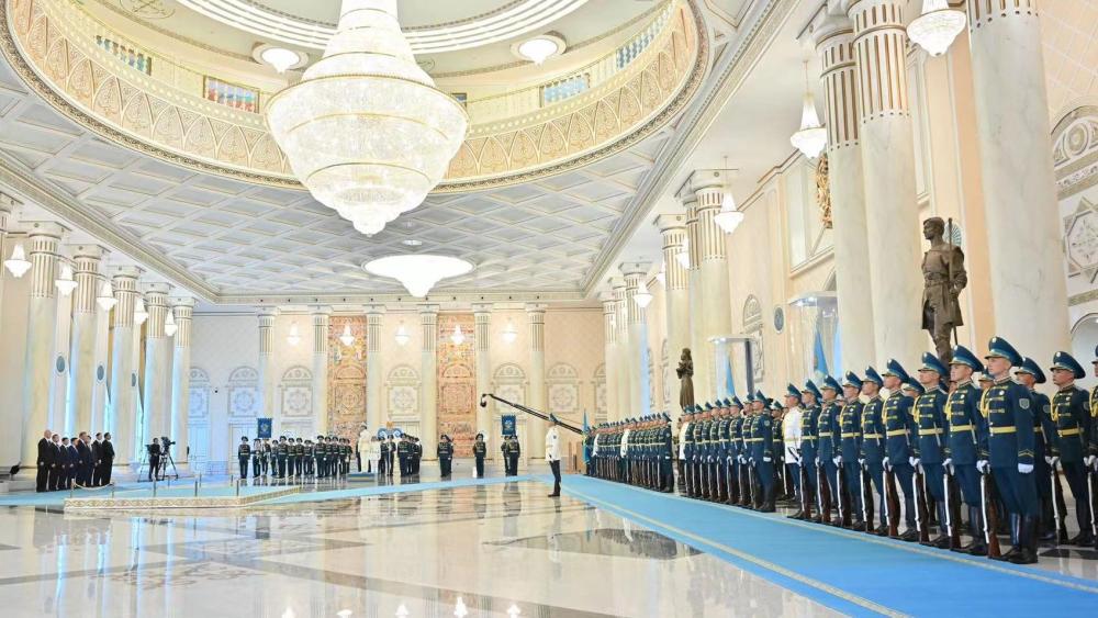 托卡耶夫為(wei) 習(xi) 近平舉(ju) 行隆重歡迎儀(yi) 式。總統府大廳氣勢恢宏,禮兵威武挺拔。兩(liang) 國元首分別同對方陪同人員一一握手致意。兩(liang) 國元首登上檢閱台,軍(jun) 樂(le) 團奏中哈兩(liang) 國國歌。習(xi) 近平在托卡耶夫陪同下檢閱儀(yi) 仗隊。