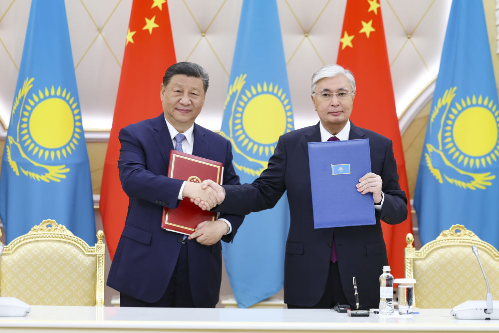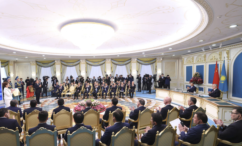 兩(liang) 國元首共同簽署《中華人民共和國和哈薩克斯坦共和國聯合聲明》,並共同見證交換經貿、互聯互通、航空航天、教育、媒體(ti) 等領域數十項雙邊合作文件。