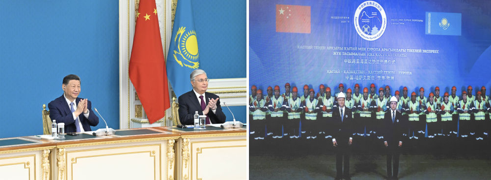 中午,習(xi) 近平同托卡耶夫在阿斯塔納總統府以視頻方式共同出席中歐跨裏海直達快運開通儀(yi) 式。哈方項目負責人向兩(liang) 國元首匯報準備情況,中方項目負責人請兩(liang) 國元首下達指令。兩(liang) 國元首共同下達作業(ye) 指令:“啟運!”兩(liang) 國元首通過大屏幕觀看車輛登船、集裝箱裝船等實時情況。現場響起熱烈掌聲。