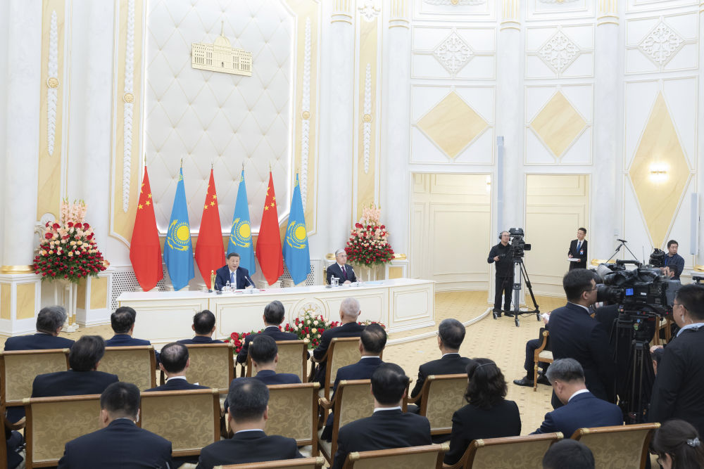 習(xi) 近平在阿斯塔納總統府同托卡耶夫共同會(hui) 見記者。