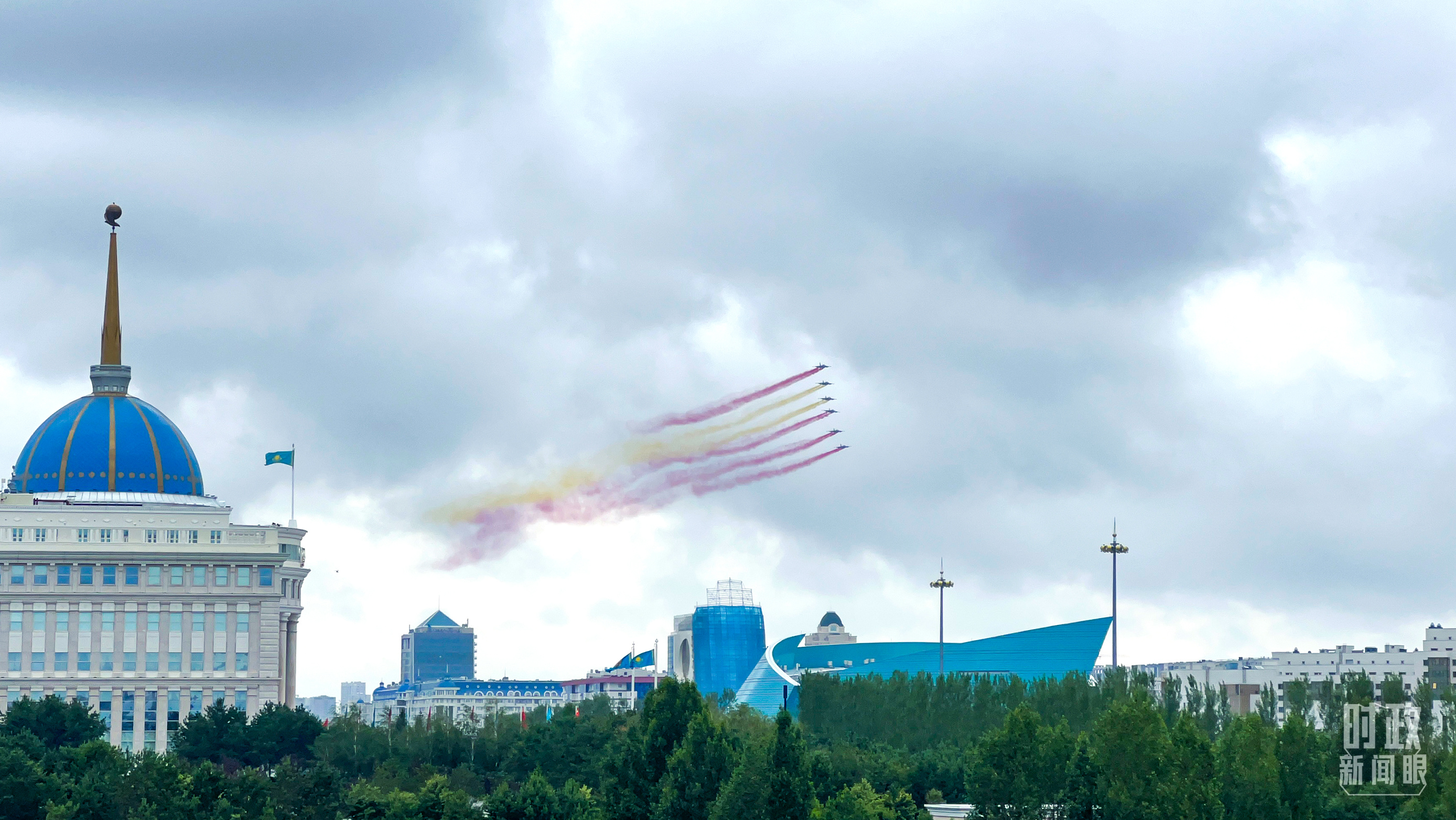 習(xi) 主席乘車抵達哈總統府時,托卡耶夫總統熱情迎接。六架哈薩克斯坦空軍(jun) 戰機從(cong) 總統府上空飛過,拉出象征中國國旗色彩的紅黃色彩煙,以最高禮儀(yi) 歡迎中國貴賓。