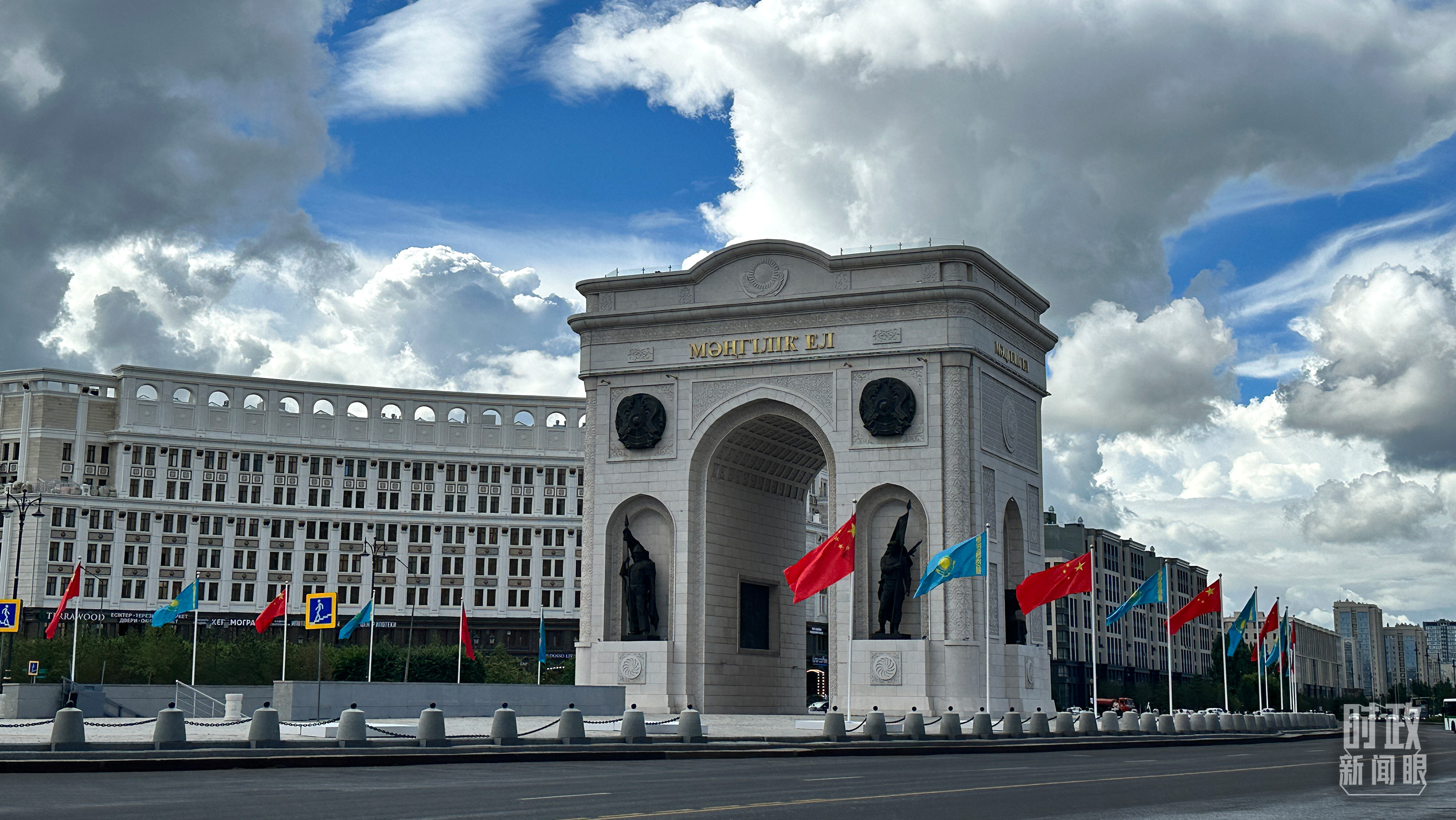 阿斯塔納地標建築“凱旋門”兩(liang) 側(ce) ,中哈兩(liang) 國國旗迎風招展。(總台央視記者關(guan) 舟拍攝)
