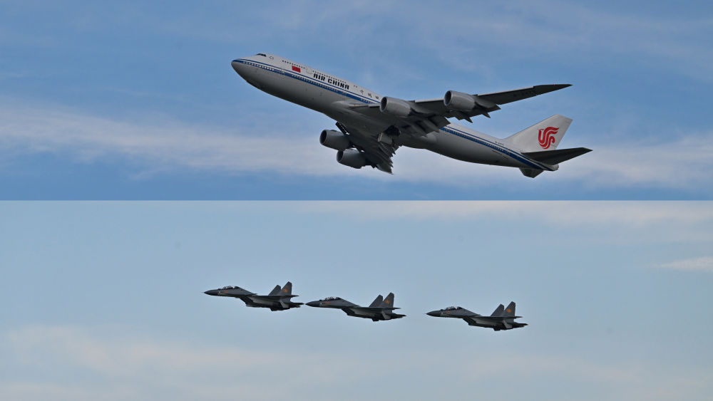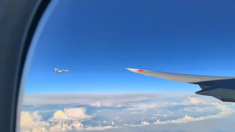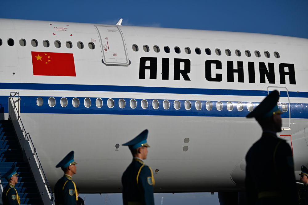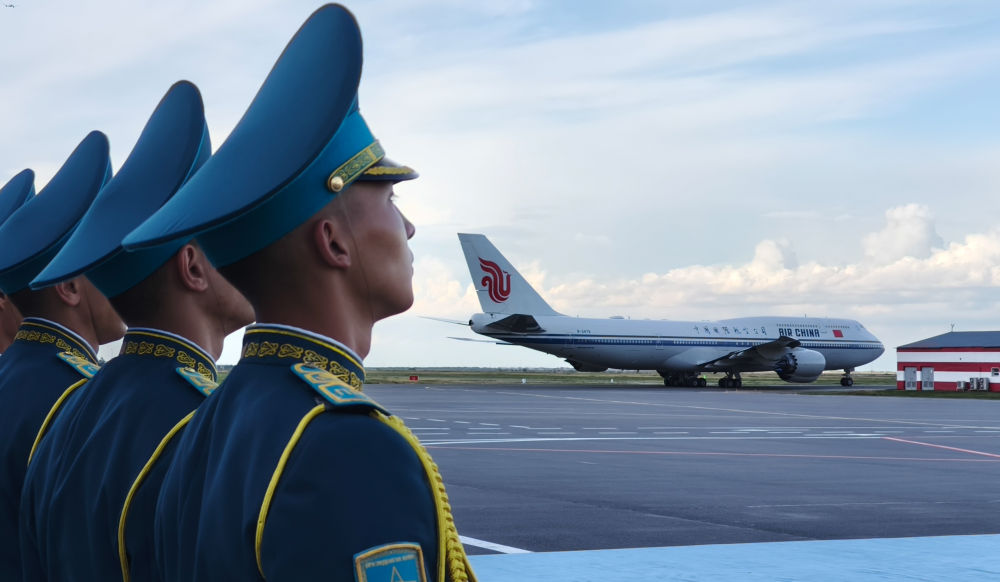 習(xi) 近平專(zhuan) 機起飛後,哈薩克斯坦三架空軍(jun) 戰機升空護航。