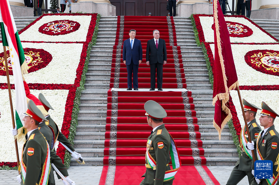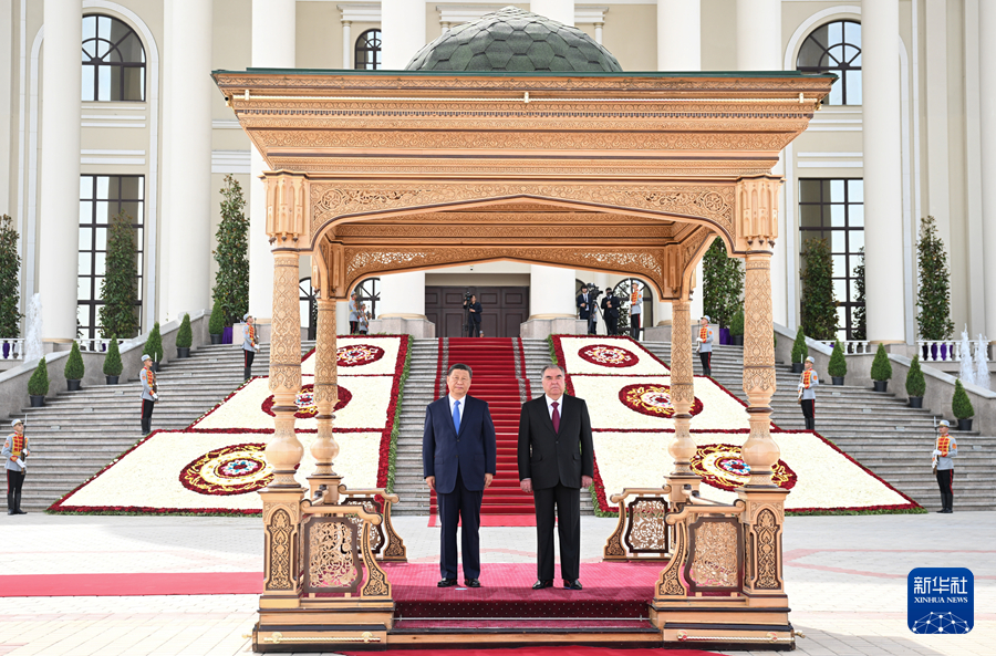 當地時間7月5日下午,國家主席習(xi) 近平同塔吉克斯坦總統拉赫蒙在杜尚別總統府舉(ju) 行會(hui) 談。拉赫蒙為(wei) 習(xi) 近平舉(ju) 行盛大隆重的歡迎儀(yi) 式。