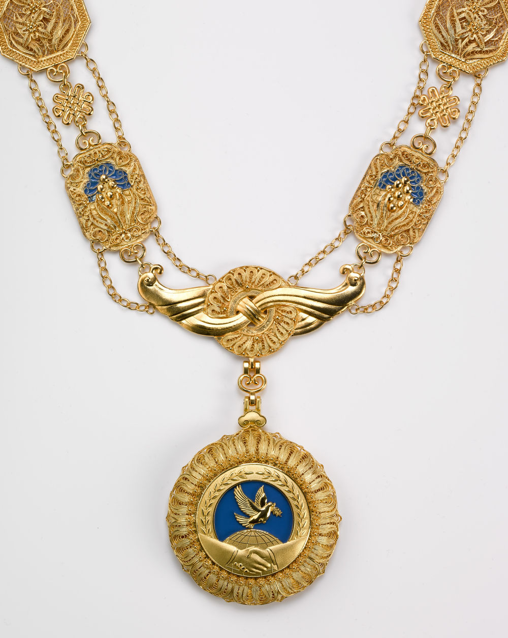 “友誼勳章”章體(ti) 以金色、藍色為(wei) 主色調,采用和平鴿、地球、握手、荷花等元素,章鏈采用中國結、萬(wan) 年青、牡丹花、玉璧、蘭(lan) 草等元素,整體(ti) 采用花絲(si) 鑲嵌、掐絲(si) 琺琅等傳(chuan) 統工藝手工製作。設計製作象征中國人民同各國人民友好團結、友誼長存,祝願世界各國共同繁榮發展。