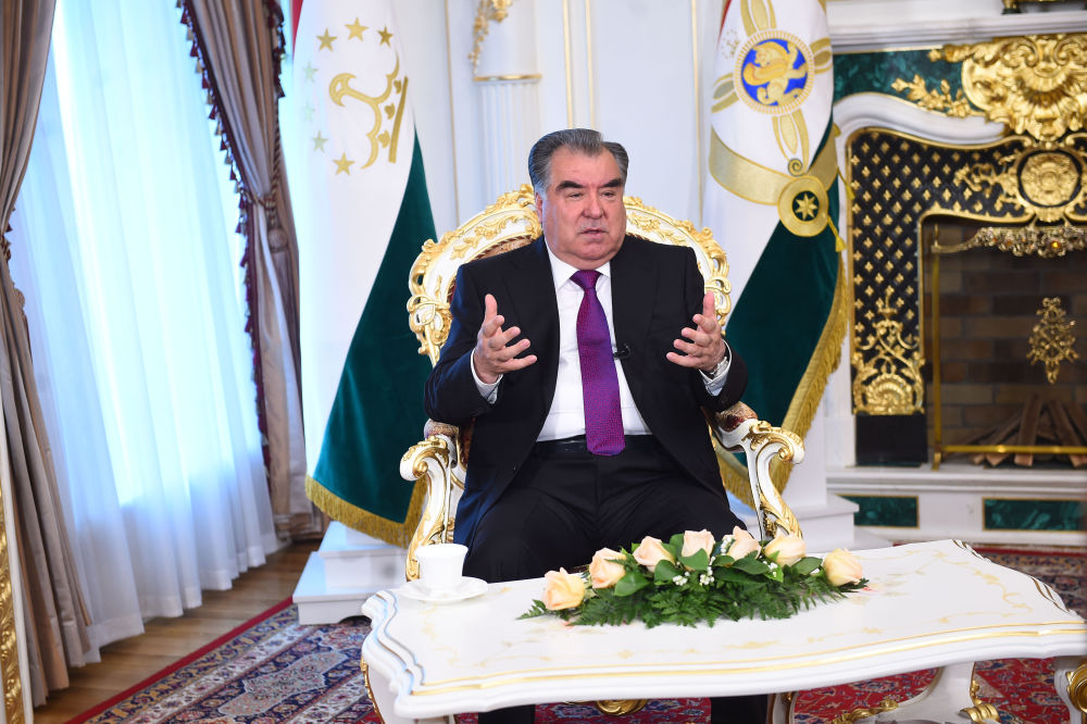 2019年4月13日,塔吉克斯坦總統拉赫蒙在杜尚別接受中國媒體(ti) 聯合采訪。