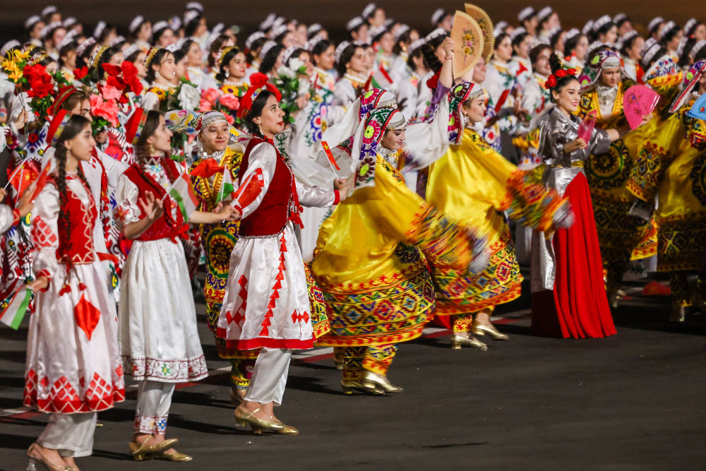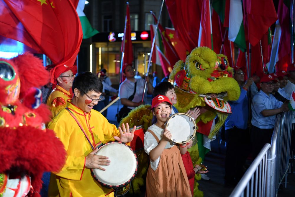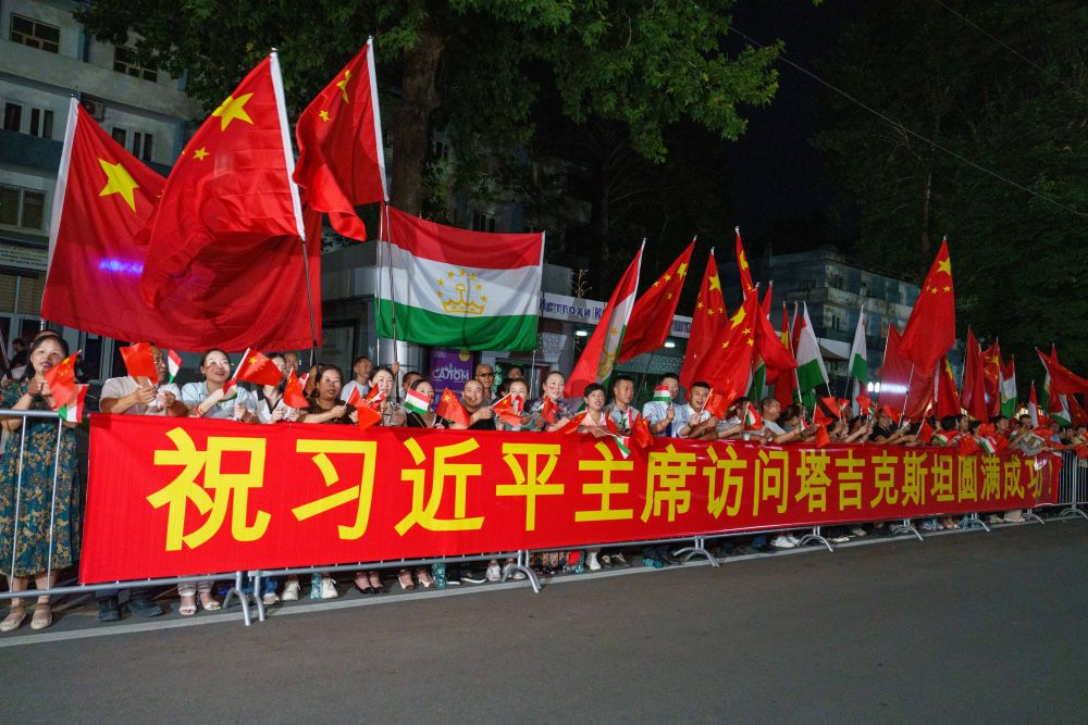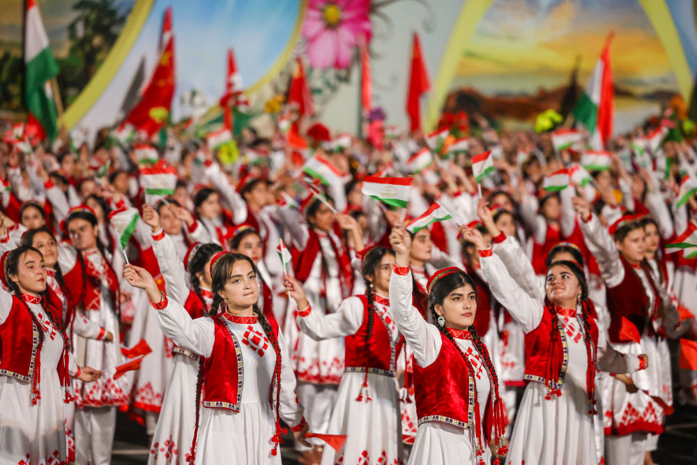 1500多名身著民族盛裝的塔吉克斯坦青年表演富有濃鬱特色的中塔歌舞,揮舞中塔兩(liang) 國國旗,表達對中國最尊貴客人的熱烈歡迎。