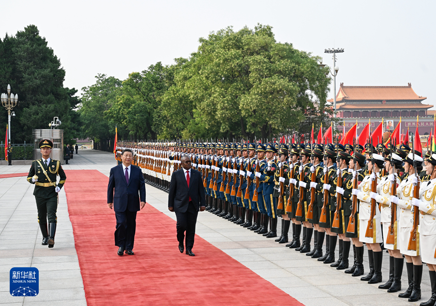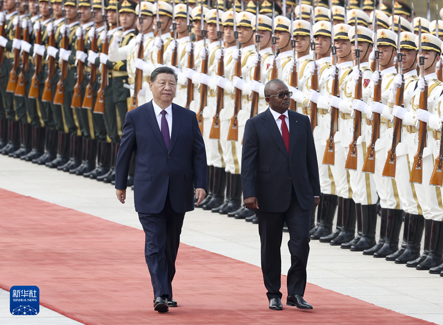 7月10日下午,國家主席習(xi) 近平在北京人民大會(hui) 堂同來華進行國事訪問的幾內(nei) 亞(ya) 比紹總統恩巴洛舉(ju) 行會(hui) 談。這是會(hui) 談前,習(xi) 近平在人民大會(hui) 堂東(dong) 門外廣場為(wei) 恩巴洛舉(ju) 行歡迎儀(yi) 式。新華社記者 饒愛民 攝
