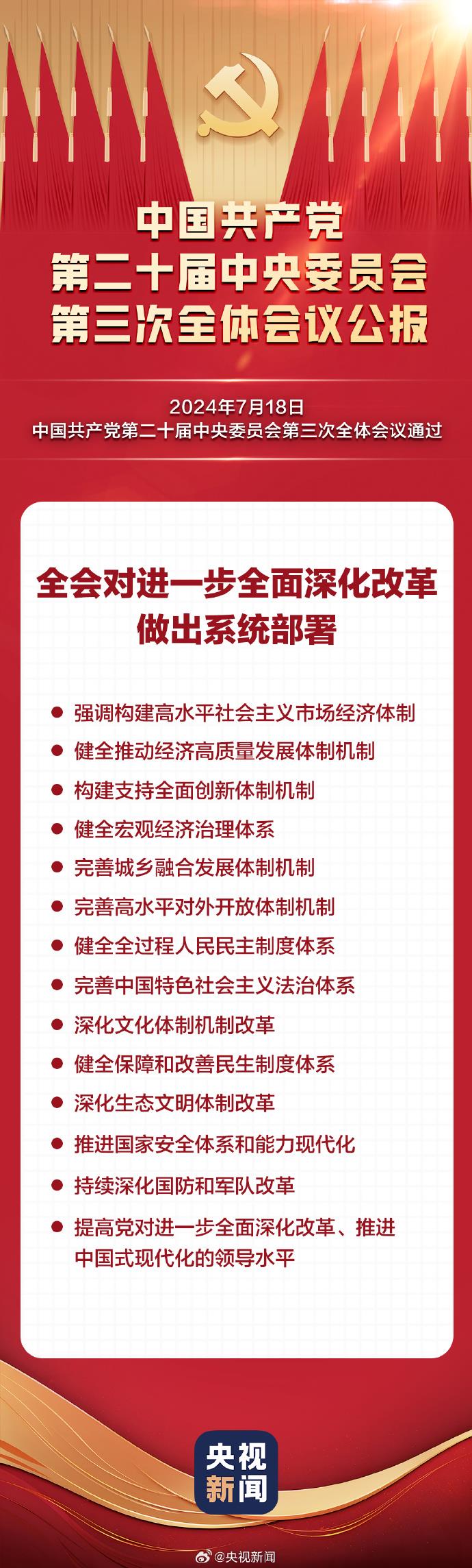 中國共產(chan) 黨(dang) 第二十屆中央委員會(hui) 第三次全體(ti) 會(hui) 議於(yu) 2024年7月15日至18日在北京舉(ju) 行,全會(hui) 對進一步全麵深化改革做出係統部署,強調構建高水平社會(hui) 主義(yi) 市場經濟體(ti) 製,健全推動經濟高質量發展體(ti) 製機製,構建支持全麵創新體(ti) 製機製,健全宏觀經濟治理體(ti) 係,完善城鄉(xiang) 融合發展體(ti) 製機製,完善高水平對外開放體(ti) 製機製,健全全過程人民民主製度體(ti) 係,完善中國特色社會(hui) 主義(yi) 法治體(ti) 係,深化文化體(ti) 製機製改革,健全保障和改善民生製度體(ti) 係,深化生態文明體(ti) 製改革,推進國家安全體(ti) 係和能力現代化,持續深化國防和軍(jun) 隊改革,提高黨(dang) 對進一步全麵深化改革、推進中國式現代化的領導水平。