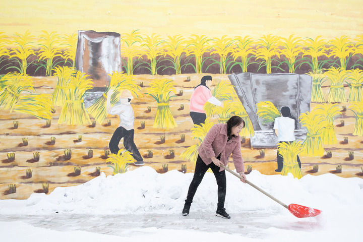 黑龍江省漠河市北極鎮北紅村“遠方故裏”民宿負責人張翠花在清理積雪(2023年1月12日攝)。