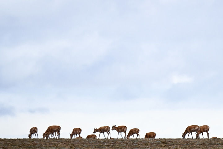 藏羚羊在青海可可西裏五道梁地區遷徙(2024年5月27日攝)。