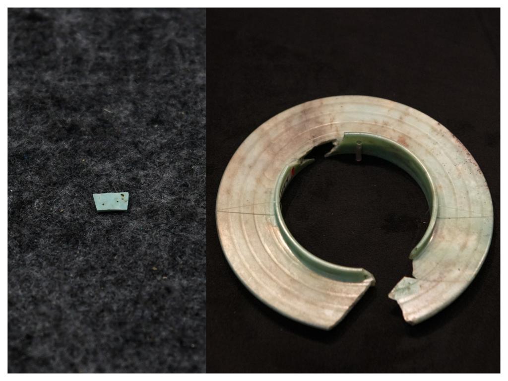 拚版照片:左圖為(wei) 2024年7月10日拍攝的三星堆遺址出土的綠鬆石片(新華社記者王曦 攝),右圖為(wei) 2024年7月21日在三星堆博物館文物保護與(yu) 修複館拍攝的有領玉璧(新華社記者唐文豪 攝)。