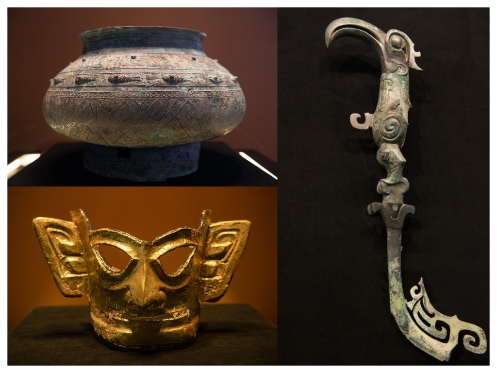 拚版照片:左上圖為(wei) 青銅瓿,左下圖為(wei) 黃金麵具,右圖為(wei) 青銅樹枝。新華社記者唐文豪 攝