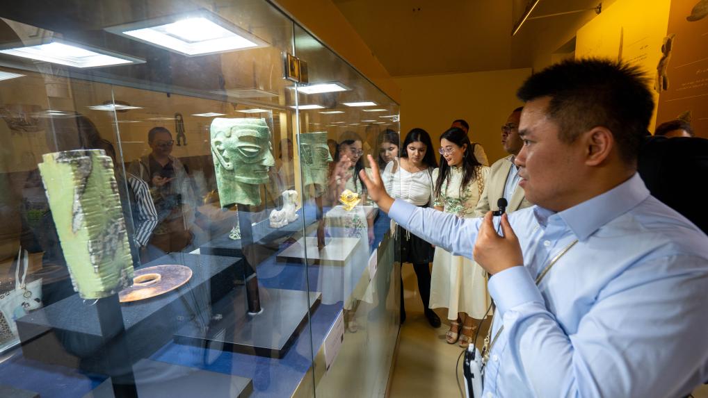 “通天神樹”、青銅鳥足神像、形態各異的青銅人頭像……三星堆博物館新館開館近一年來,已接待5.2萬(wan) 名國外遊客。“以三星堆為(wei) 代表的古蜀文明是中華文明的重要組成部分,如今我們(men) 創新展陳方式,通過與(yu) 世界其他地區同類文物作比較,向世界展示中華文明的博大精深、開放包容。”三星堆博物館景區管委會(hui) 副主任朱亞(ya) 蓉說。