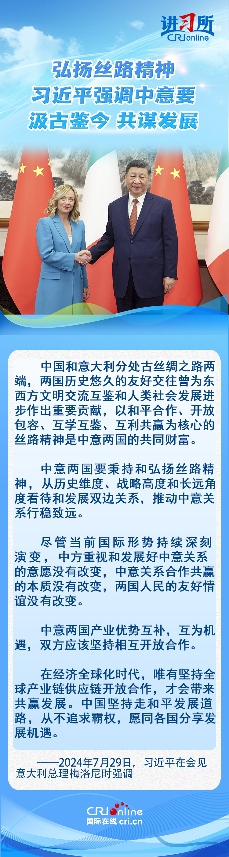 7月29日,中國國家主席習(xi) 近平在北京會(hui) 見來華進行正式訪問的意大利總理梅洛尼。習(xi) 近平指出,今年是中意建立全麵戰略夥(huo) 伴關(guan) 係20周年和馬可·波羅逝世700周年,雙方汲古鑒今、共謀發展麵臨(lin) 重要機遇。