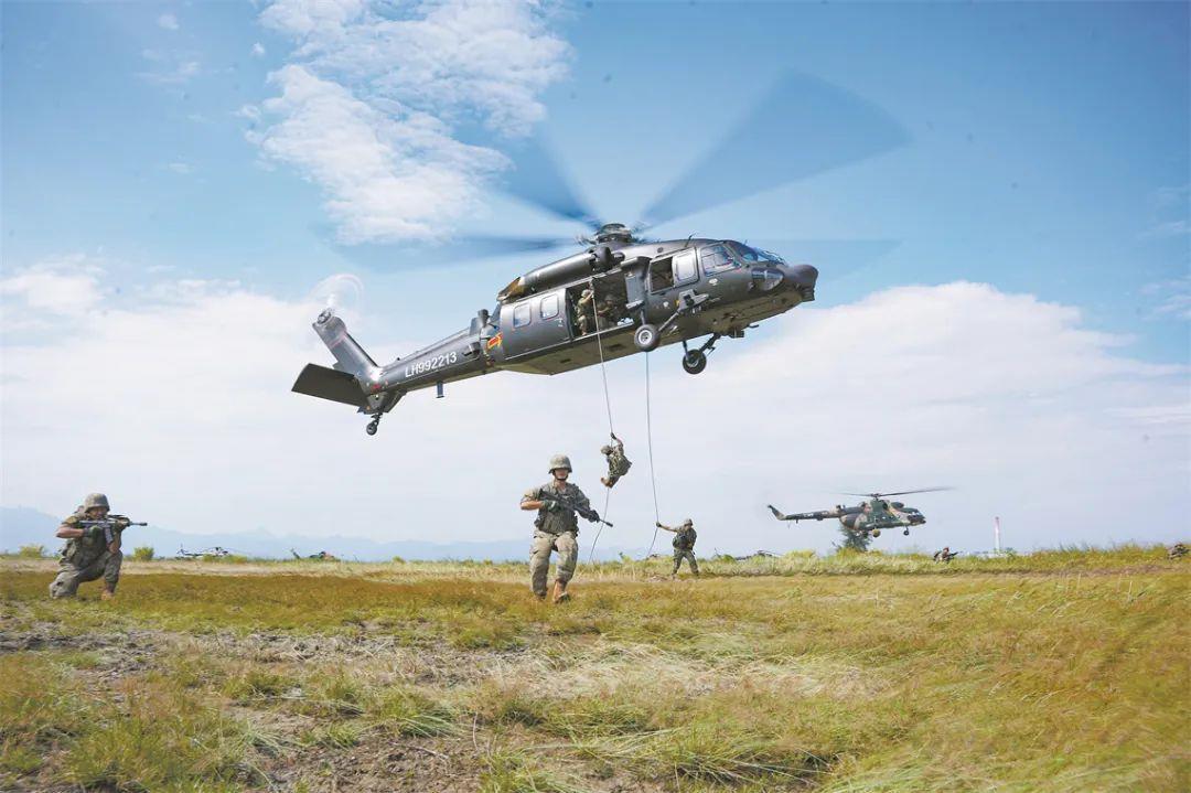 第72集團軍(jun) 某旅某合成營官兵在陸航部隊配合下開展機降訓練。