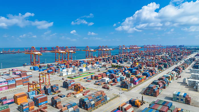 向海圖強,我國海運連接度全球領先,港口貨物吞吐量、港口集裝箱吞吐量等指標穩居世界第一。“絲(si) 路海運”聯通全球43個(ge) 國家100多個(ge) 港口。2023年,中國外貿海運量全球占比超三成。