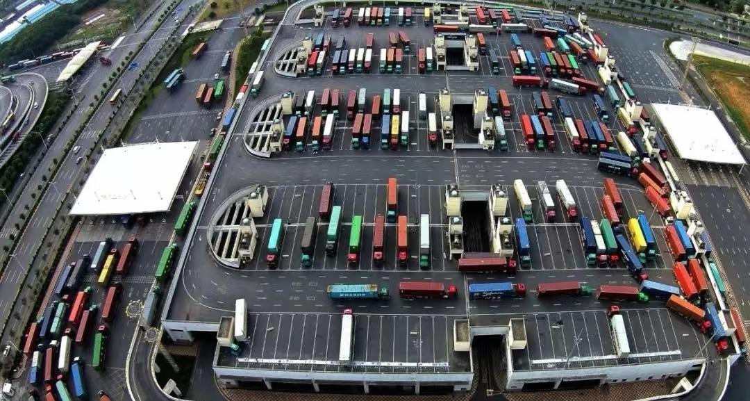 浙江義(yi) 烏(wu) 港等待通關(guan) 的集裝箱貨車