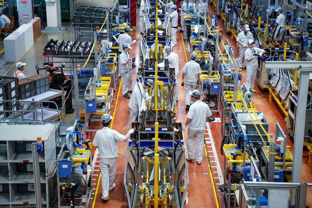 浙江湖州市長興(xing) 經濟技術開發區一家汽車部件公司,全自動機器人高速運轉生產(chan) 新能源汽車配件。