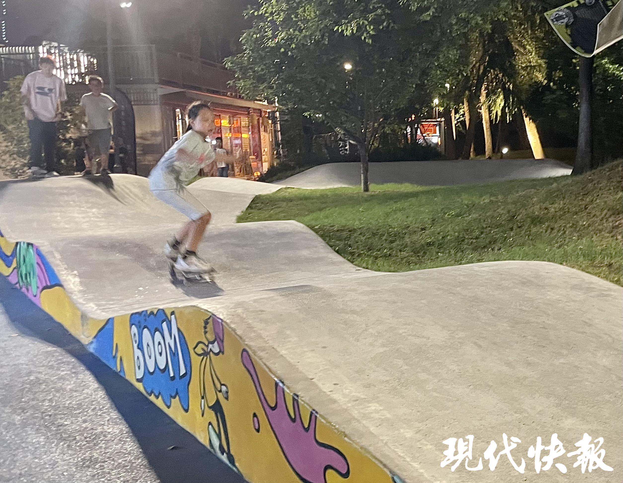 夜幕降臨(lin) ,南京西城·夜未央的滑板場地上,一群青少年正在隨著起伏不定的坡道感受風的速度。