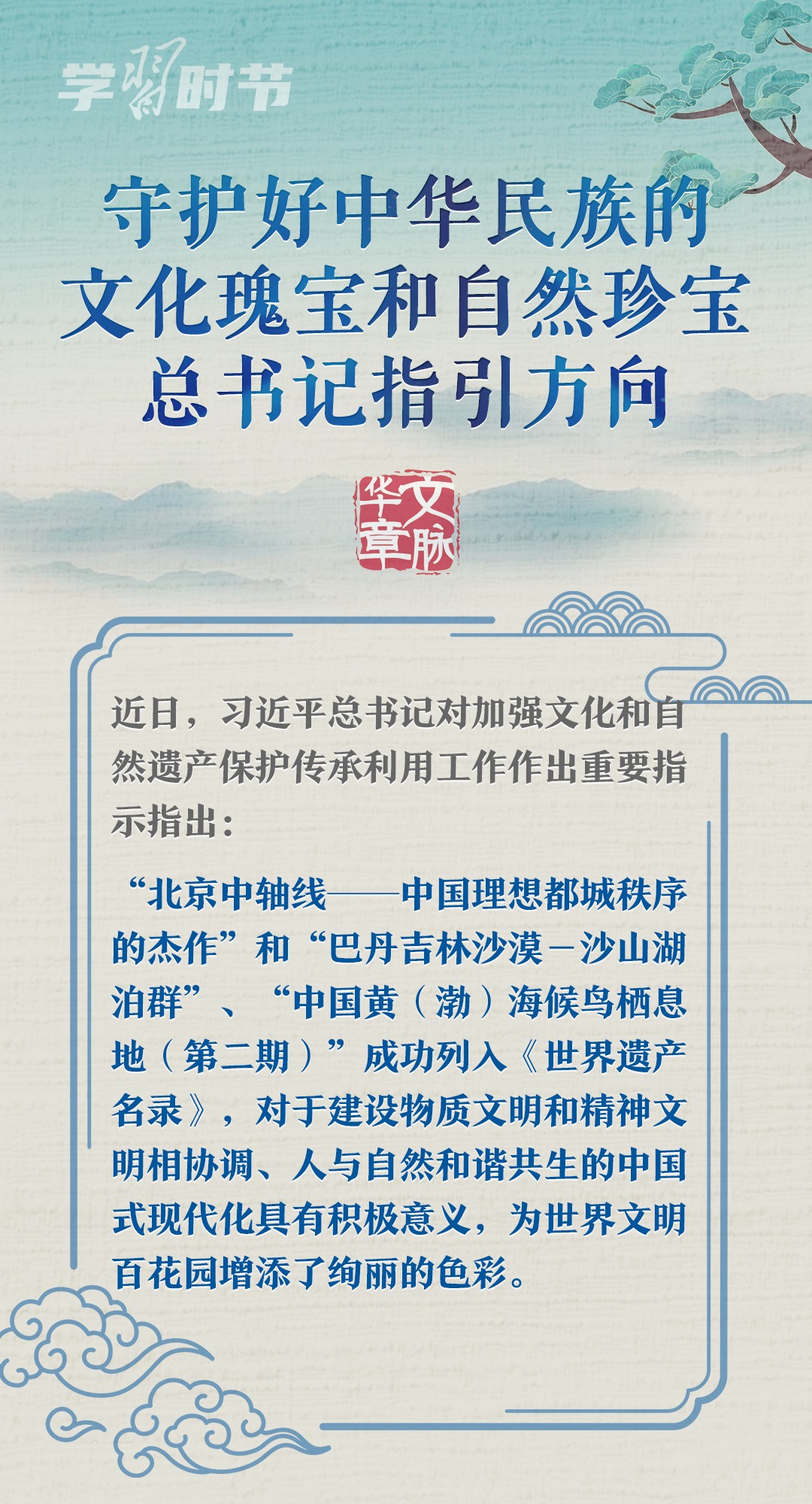 文化遺產(chan) 體(ti) 現了中華民族旺盛的生命力和創造力,自然遺產(chan) 昭示了神奇的自然造化同中華民族的和諧依存關(guan) 係。習(xi) 近平總書(shu) 記一直以來高度重視文化和自然遺產(chan) 保護傳(chuan) 承利用工作,近日專(zhuan) 門就此作出重要指示強調,守護好中華民族的文化瑰寶和自然珍寶,讓文化和自然遺產(chan) 在新時代煥發新活力綻放新光彩。讓我們(men) 一同學習(xi) 。