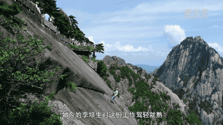 李培生在黃山景區從(cong) 事環衛保潔工作。他憑借一根繩索,在峭壁上“行走”自如,撿拾掉落的物品。