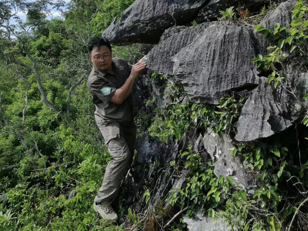 齊旭明在熱帶雨林中監測海南長臂猿活動。(受訪者供圖)