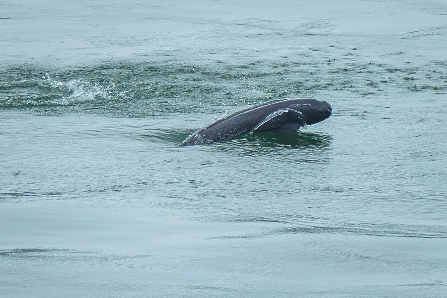 長江江豚在湖北省宜昌市葛洲壩下遊水域逐浪嬉戲(2024年5月21日攝)。新華社記者 肖藝九 攝