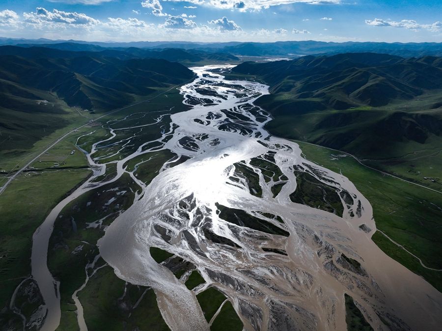 在青海省果洛藏族自治州達日縣境內(nei) 拍攝的黃河(2024年7月31日攝,無人機照片)。新華社記者 張龍 攝