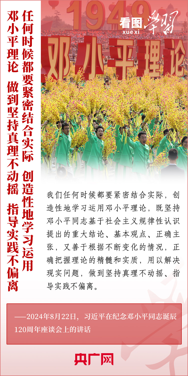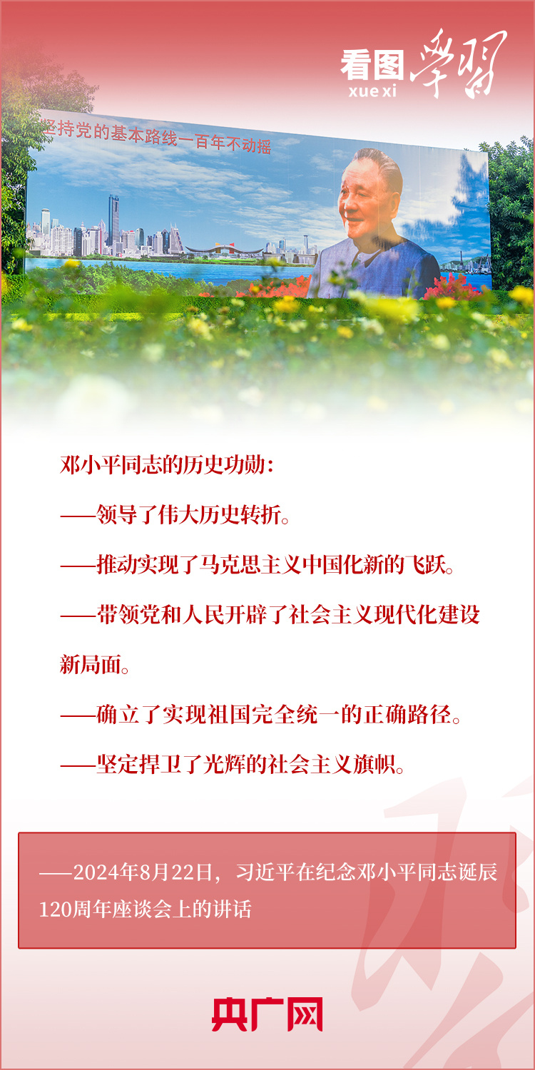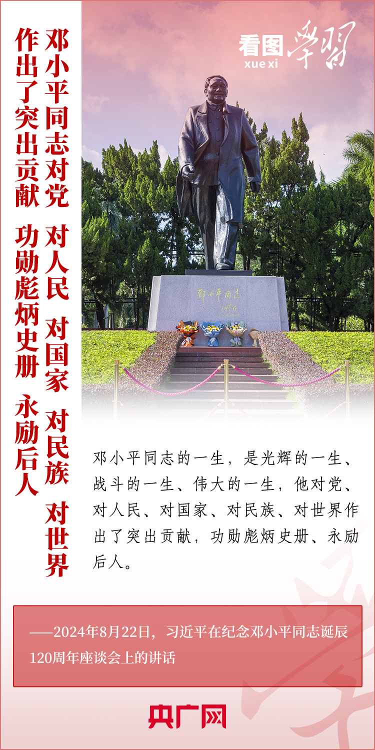 8月22日,習(xi) 近平總書(shu) 記在紀念鄧小平同誌誕辰120周年座談會(hui) 上發表重要講話指出,鄧小平同誌的曆史功勳是全方位的、開創性的,對中國和世界的影響是深刻的、長遠的。總書(shu) 記強調,對鄧小平同誌最好的紀念,就是把他開創的中國特色社會(hui) 主義(yi) 事業(ye) 繼續推向前進。我們(men) 要緊緊圍繞以中國式現代化全麵推進強國建設、民族複興(xing) 偉(wei) 業(ye) 這個(ge) 中心任務,繼往開來,奮發進取。一起來學習(xi) !
