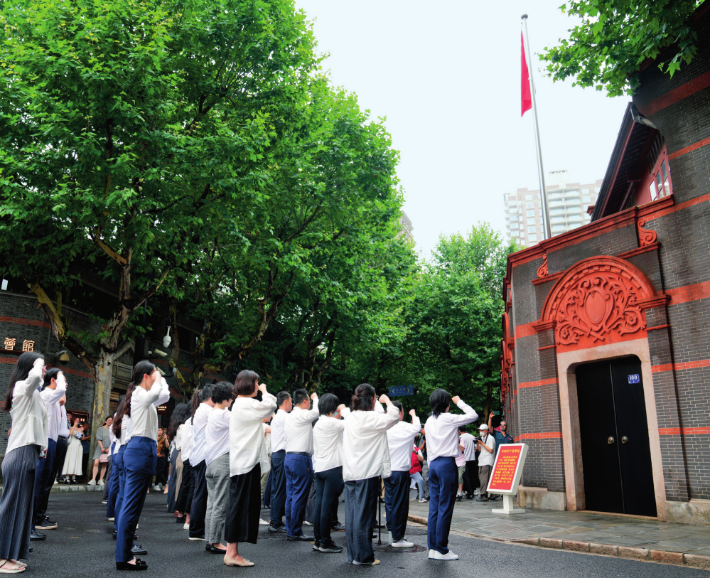 中共一大紀念館的黨(dang) 員在一大會(hui) 址前重溫入黨(dang) 誓詞(2024年7月1日攝) 劉穎攝 / 本刊