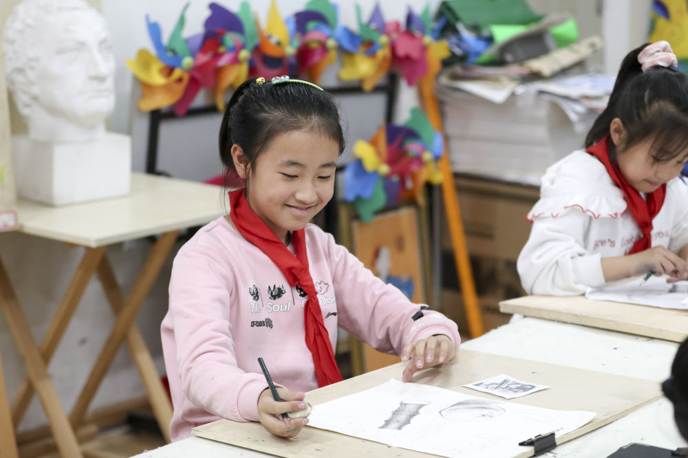 2021年10月27日,學生在黑龍江省哈爾濱市榆樹鎮中心校新鄉(xiang) 小學鄉(xiang) 村學校少年宮參加美術學習(xi) 班。近年來,黑龍江省各地以鄉(xiang) 村小學為(wei) 基礎,大力發展鄉(xiang) 村學校少年宮,開設德育、文藝、體(ti) 育、科普、手工等多種課外活動,滿足學生需求,培養(yang) 孩子們(men) 的興(xing) 趣愛好和特長。