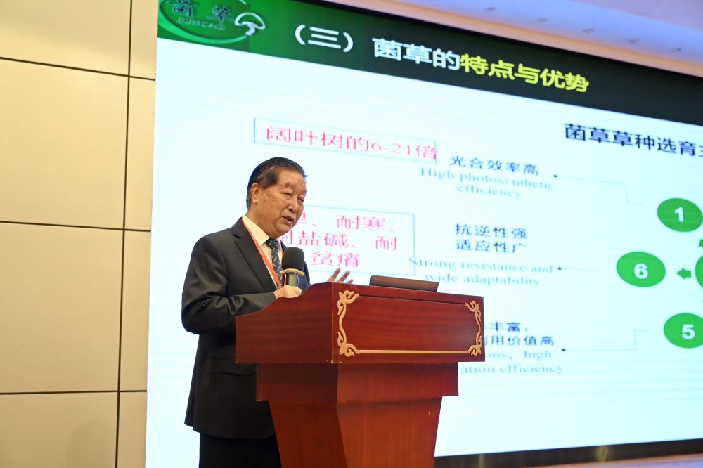 6月16日,第十九屆國際菌草產(chan) 業(ye) 發展研討會(hui) 在福建福州舉(ju) 行,國家菌草工程技術研究中心首席科學家林占熺發表《菌草技術助力落實聯合國可持續發展目標的潛力》主旨報告。新華社記者 林善傳(chuan) 攝