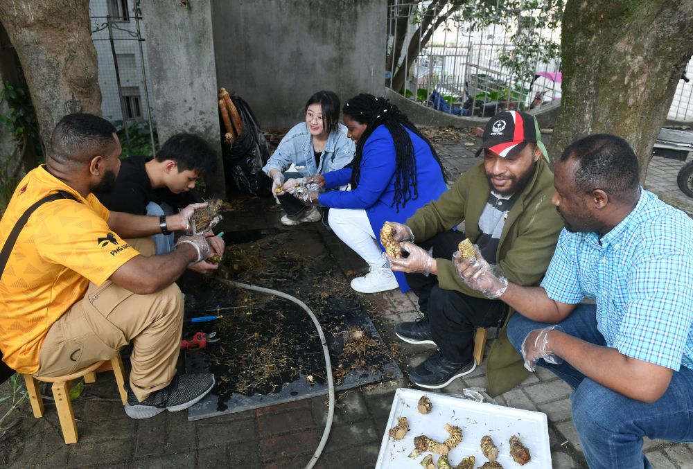 3月28日,在位於(yu) 福州的福建農(nong) 林大學,來自盧旺達和巴布亞(ya) 新幾內(nei) 亞(ya) 的學生與(yu) 菌草專(zhuan) 業(ye) 學生交流。新華社記者 林善傳(chuan) 攝